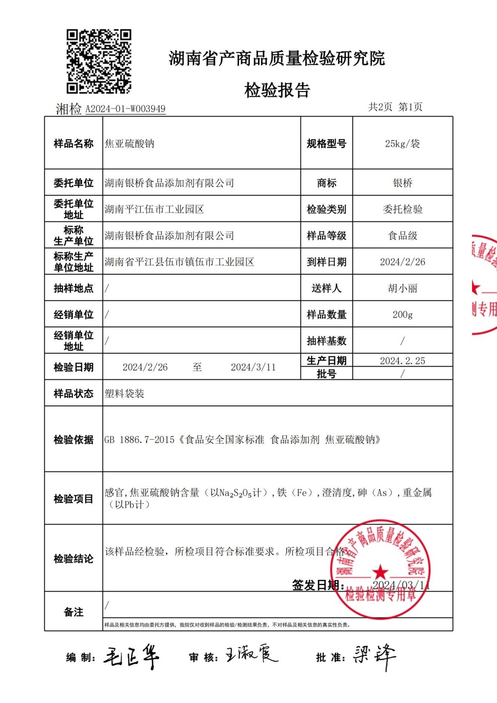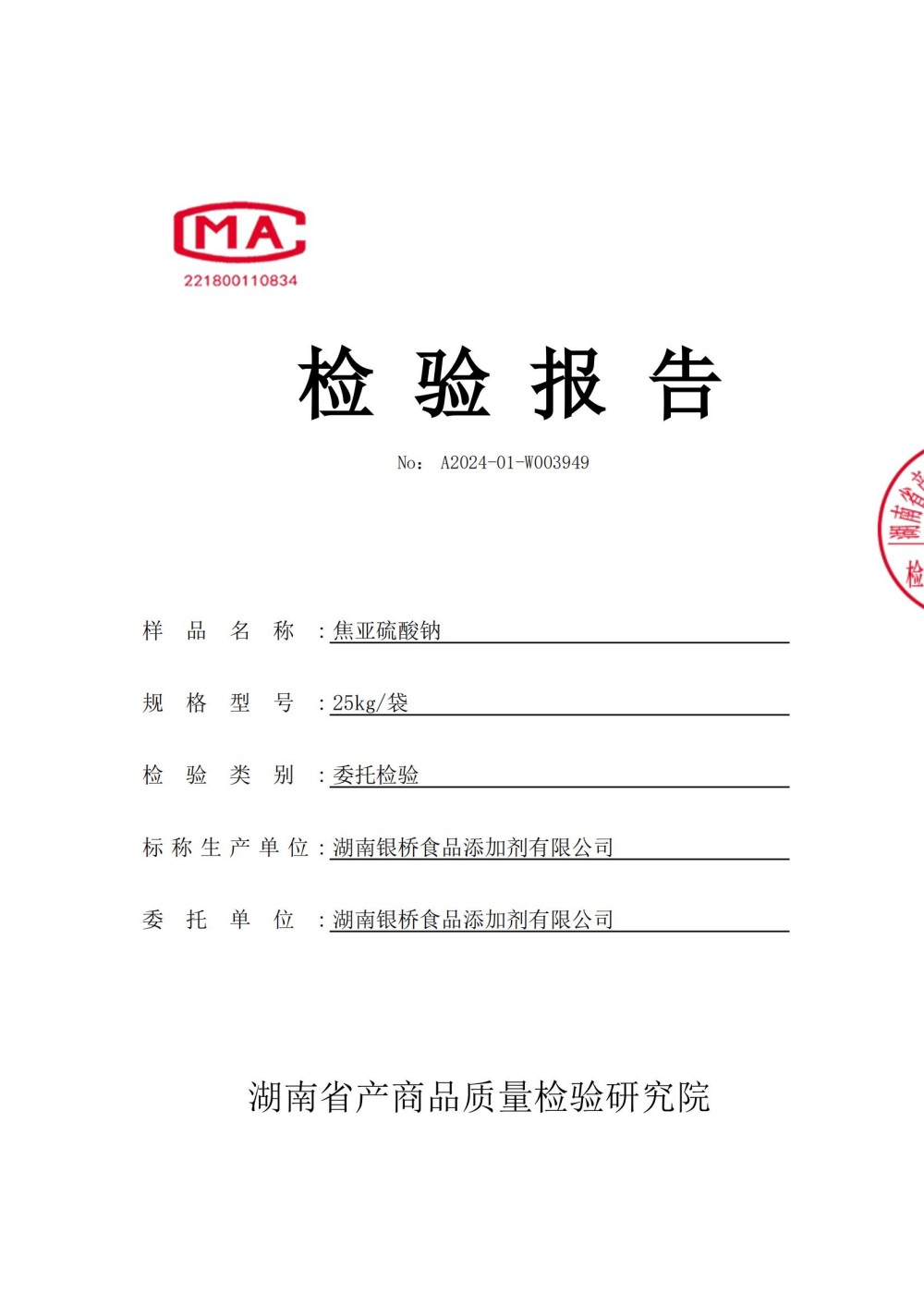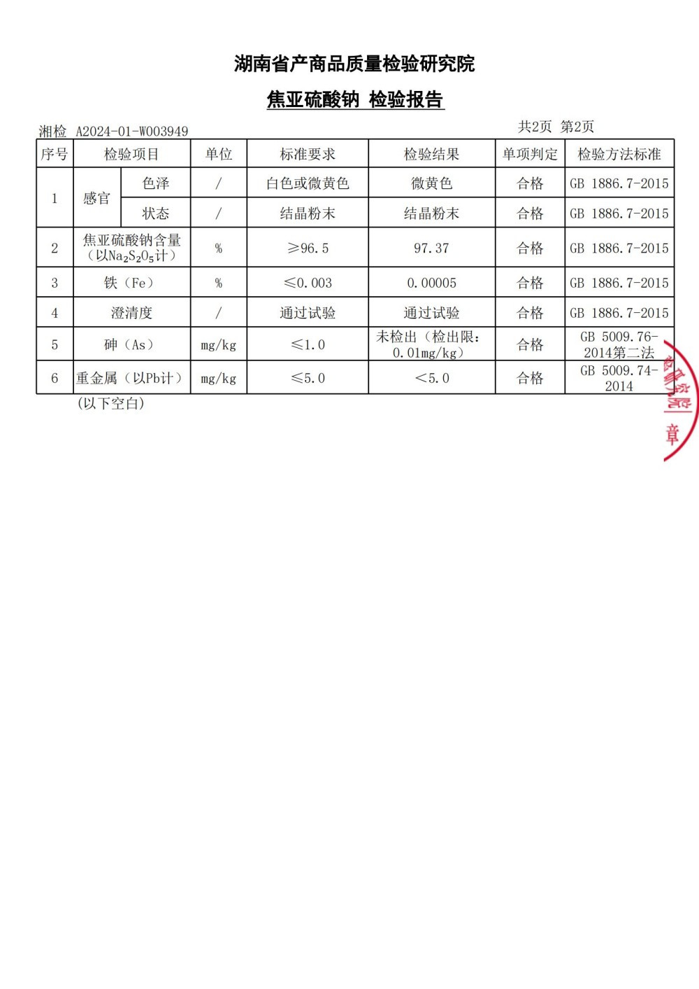 食品級焦亞質(zhì)檢報告